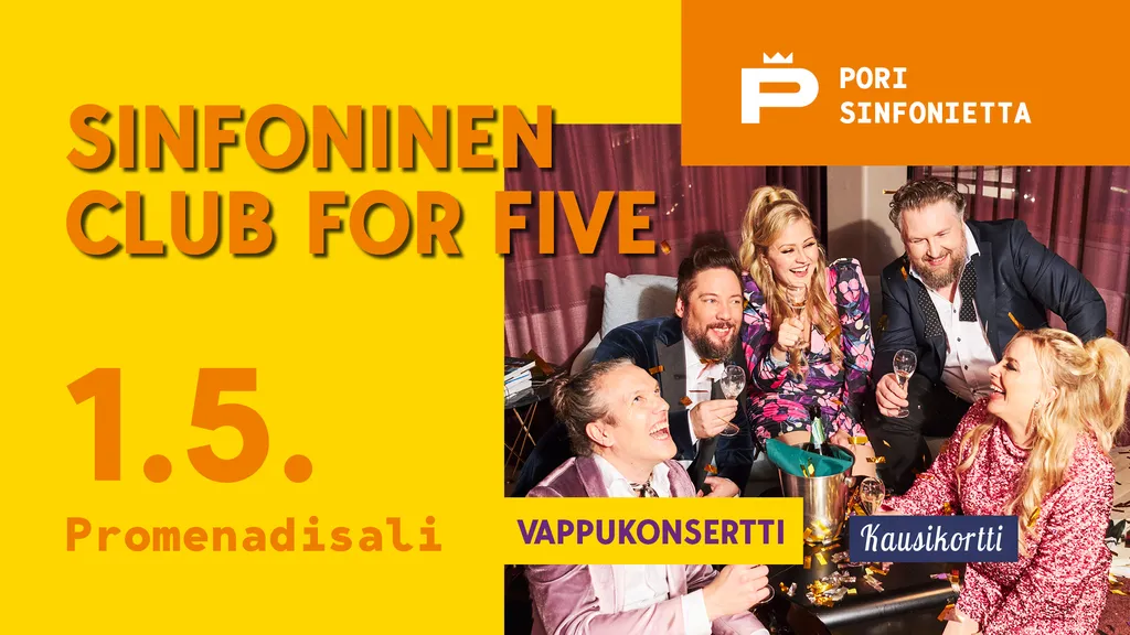 Pori Sinfoniettan vappukonsertin tunnelman kohottaa lauluyhtye Club for Five. Orkesteri ja viisi virtuoottista laulajaa luovat upeita äänimaailmoja.